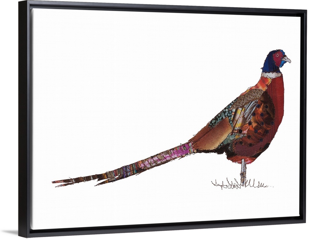 <p>Horizontal artwork of a pheasant in a collage style outlined in stitches.</p>