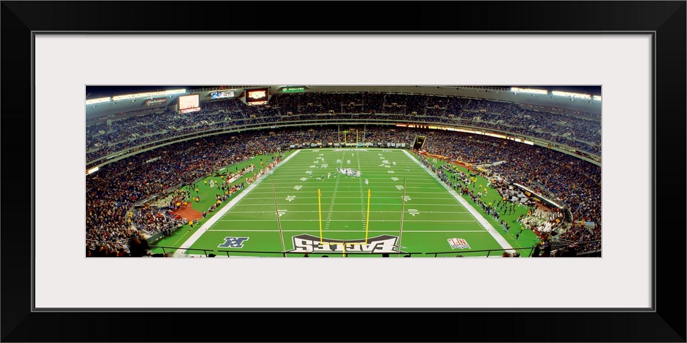 <p>Panoramic photograph taken above an end zone of a National Football League team's field located within the nicknamed "City of Brotherly Love". Fans can be seen packing the seats surrounding the arena.</p>
