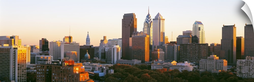 <p>Giant, panoramic photograph of the sun shining on the skyline of Philadelphia.</p>