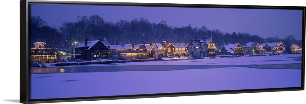 <p>Panoramic image of a buildings in Philadelphia, Pennsylvania lit up for the holidays in the snow.</p>
