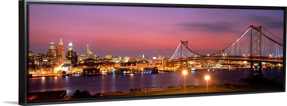<p>Oversized panoramic artwork of a night time photograph of the Benjamin Franklin Bridge leading to downtown.</p>
