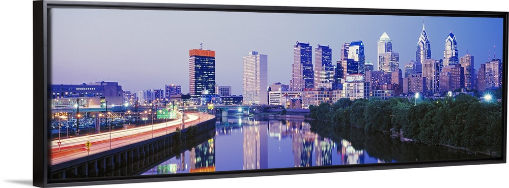 <p>This artwork is a panoramic canvas of the city skyline reflecting in the river water at dusk.</p>