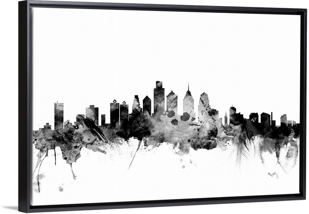 <p>Contemporary artwork of the Philadelphia city skyline in black watercolor paint splashes.</p>