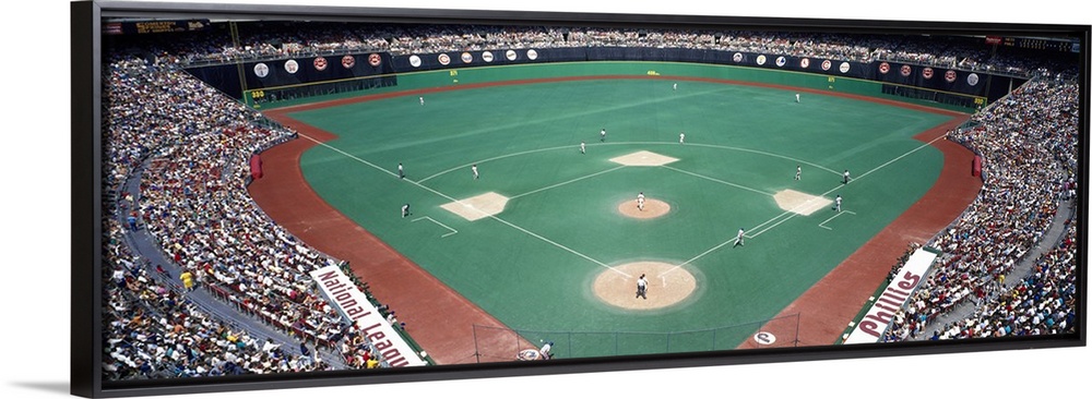 <p>Wide angle photograph of Veterans Stadium in Pennsylvania. The stands are packed with fans during a Phillies versus Mets baseball game.</p>