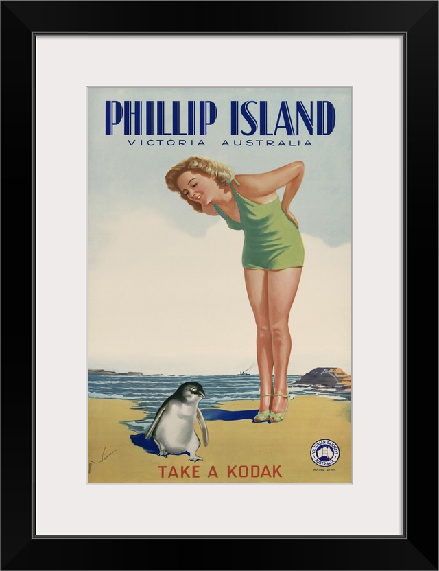 <p>Phillip Island, Victoria, Australia. Take a Kodak. 1930s travel poster for Victorian Railways Australia of a bathing beauty on a beach with a penguin.</p>