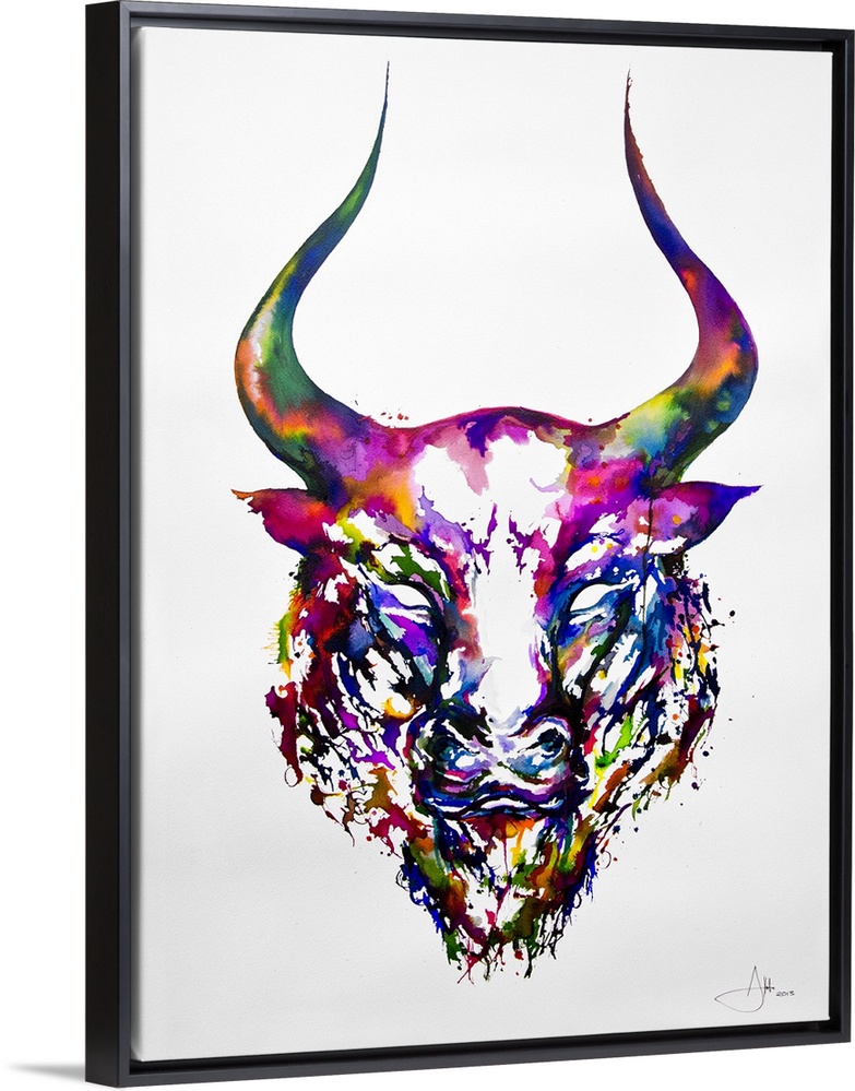 <p>Watercolor and ink painting of the head of a bull with large horns.</p>