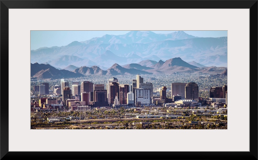 <p>Photograph of the Phoenix, Arizona skyline with hazy desert mountains in the background.</p>