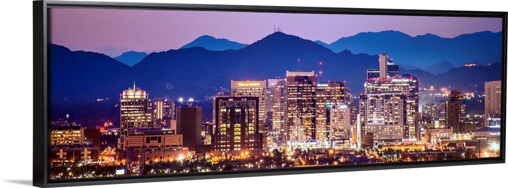 <p>Panoramic photograph of a colorful sunset over the Phoenix, Arizona skyline with silhouetted mountains in the background.</p>