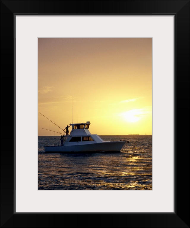 <p>Photo, Silhouette view of a fishing boat during sunset</p>