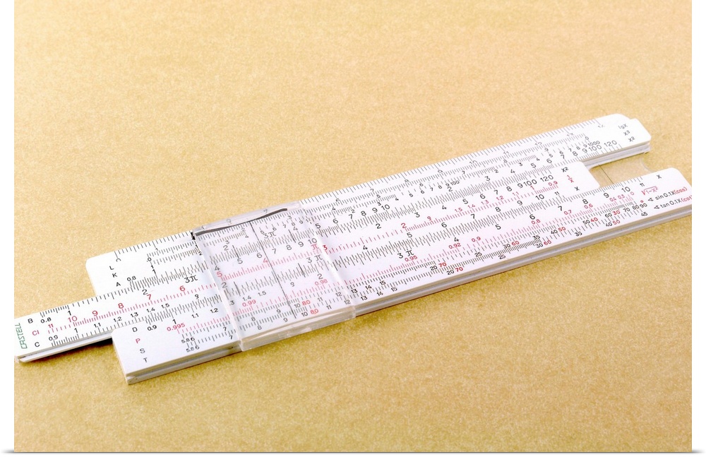 <p>Logarithmic slide rule. This adjustable ruler contains the values for logs, which are used to aid multiplication and division. Logarithms are mathematical functions relating numbers to the powers of a set base number such as ten. Slide-rules have been superseded by the use of electronic calculators.</p>
