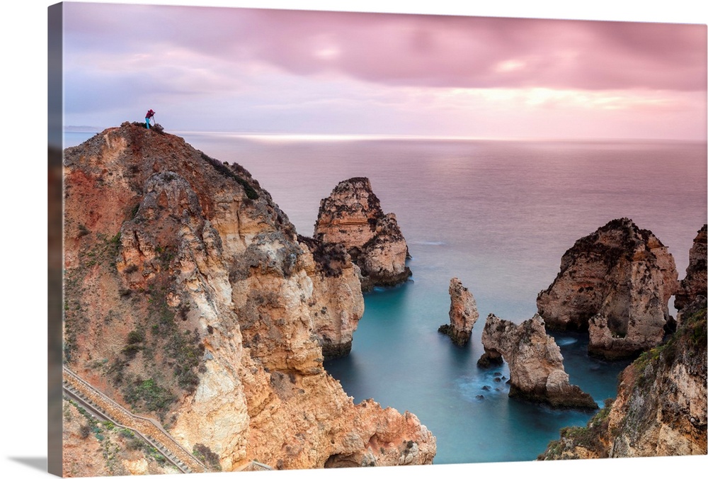 <p>Photographer on top of cliffs surrounded by sea under the pink sky at sunrise, Ponta Da Piedade, Lagos, Algarve, Portugal</p>