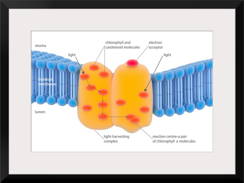 <p>Photosynthesis light-harvesting complex. Illustration of the light-harvesting complex (orange) found on the thylakoid membrane (blue) in the chloroplasts of plants. This is the location of chlorophyll and carotenoid pigment molecules (orange) that take part in photosynthesis. They absorb incoming light, with a cascade effect leading to a reaction centre (lower centre), a pair of chlorophyll 'a' molecules. The energy is transferred out through an electron acceptor (red, upper centre) and used in further reactions elsewhere on the membrane. For this artwork without labels, see image C023/8814.</p>