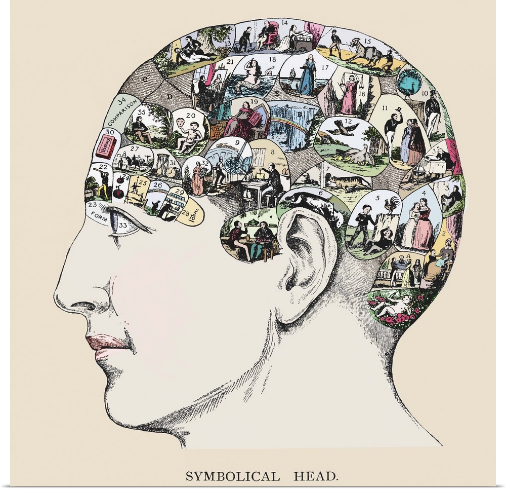 <p>Phrenology chart. Phrenology is a pseudo-science that states that a person's personality and character can be deduced by studying the shape of his or her skull. Certain areas of the skull are thought to be linked to specific characteristics. This chart shows pictures associated with different faculties over the area of the skull with which they are supposedly connected. For instance along the top of the head from left to right are depicted the characteristics of 'benevolence', 'veneration' and 'firmness'. The theory of phrenology was proposed by the German physician Franz Joseph Gall (1758-1828). Published in Picture Magazine, 1894.</p>