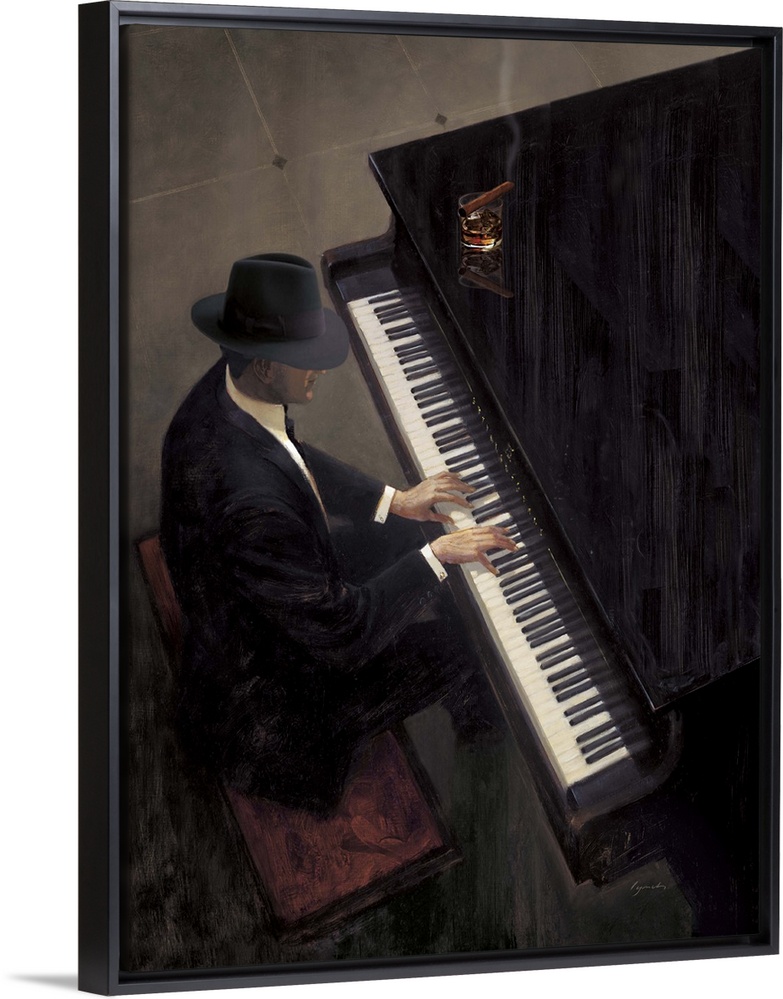<p>Contemporary painting of a man in a hat and suit playing a piano, with a cigar and drink sitting on top of the piano.</p>