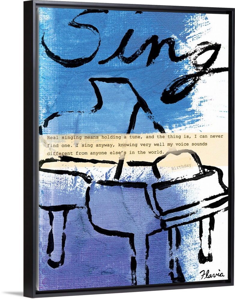 <p>Mixed media artwork of a piano outline with the text "sing" above it and a quote torn from a page overlaying it.</p>