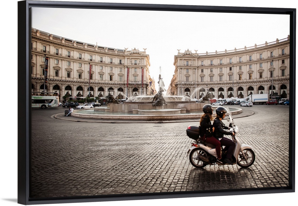 <p>Photograph of the Piazza della Repubblica with the Fountain Of The Naiads and a couple on a motorbike in the foreground, Rome.</p>