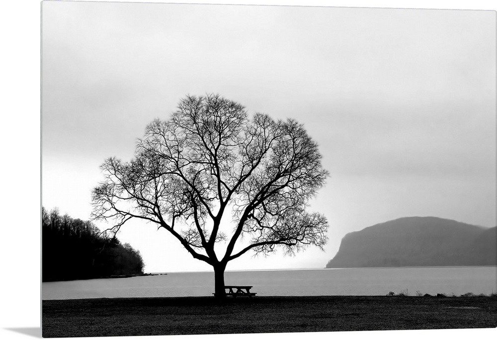 <p>A black and white photograph of a single tree with a picnic table next to a lake.</p>