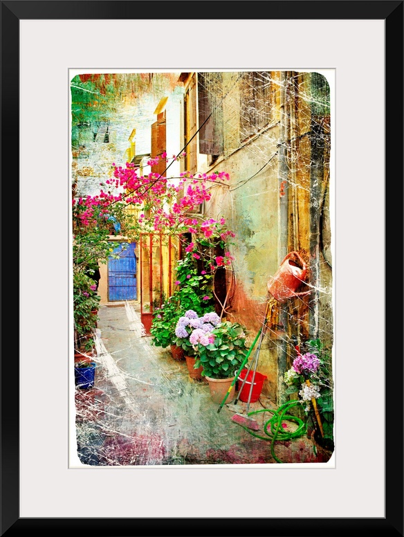 <p>pictorial courtyards of Greece- artwork in retro painting style</p>