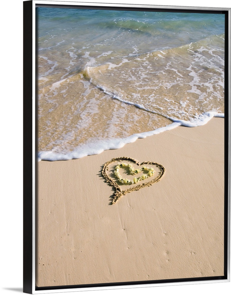 <p>Picture of a heart drawn in the sand on a tropical beach, yellow lei shaped like a heart inside of drawing</p>