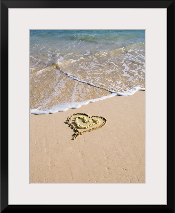 <p>Picture of a heart drawn in the sand on a tropical beach, yellow lei shaped like a heart inside of drawing</p>