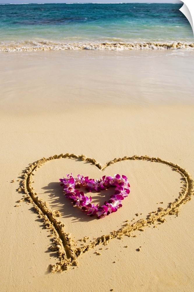 <p>Picture of a heart drawn in the sand on a tropical beach, orchid lei shaped like a heart inside of drawing</p>