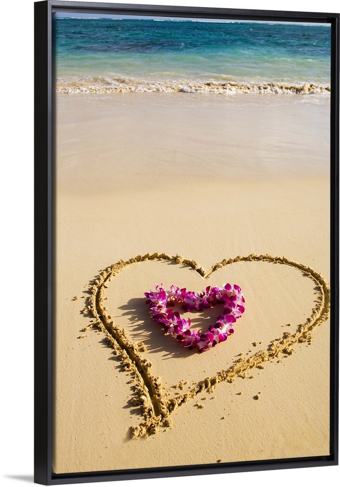 <p>Picture of a heart drawn in the sand on a tropical beach, orchid lei shaped like a heart inside of drawing</p>