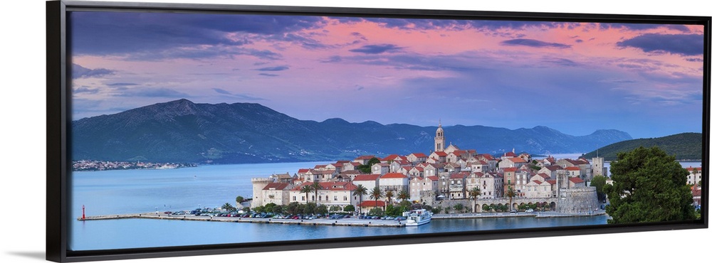 <p>Elevated view over picturesque Korcula Town illuminated at sunset, Korcula, Dalmatia, Croatia</p>
