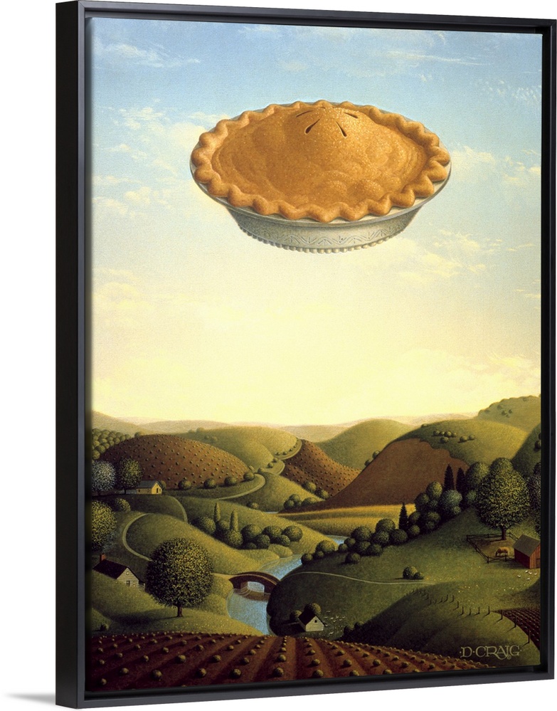 <p>A pie floats high in the sky over a valley.</p>