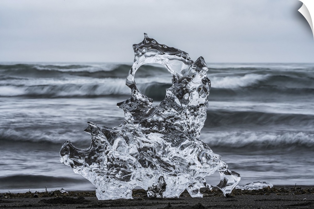 <p>Piece of ice on diamond beach, near Jokusarlon, with the ocean behind it along the south coast of Iceland, Iceland.</p>