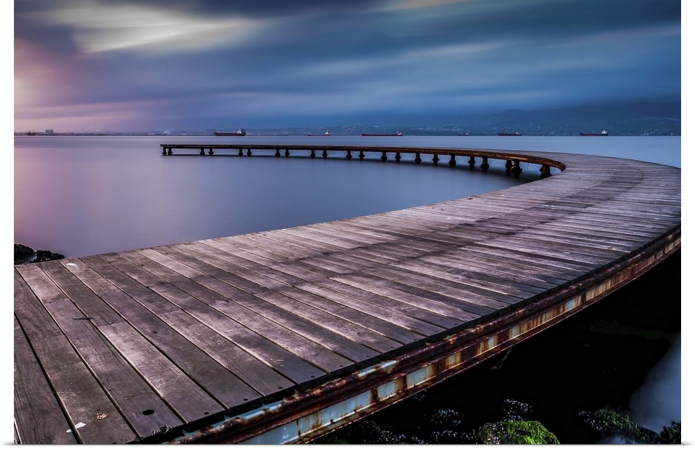 <p>Dynamic photograph of a curved pier jetting out over the water.</p>