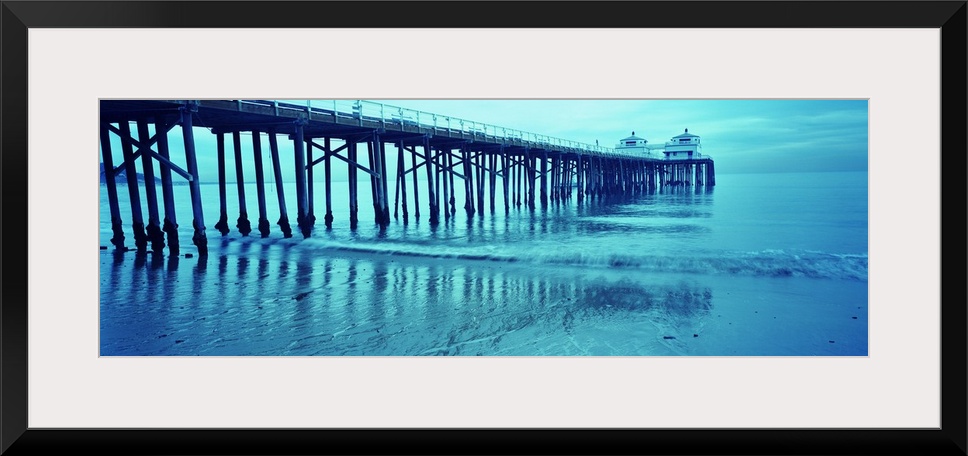 <p>Monotone photograph of a long pier reaching out into the Pacific Ocean at dusk with shallow waves receding as the tide changes.</p>