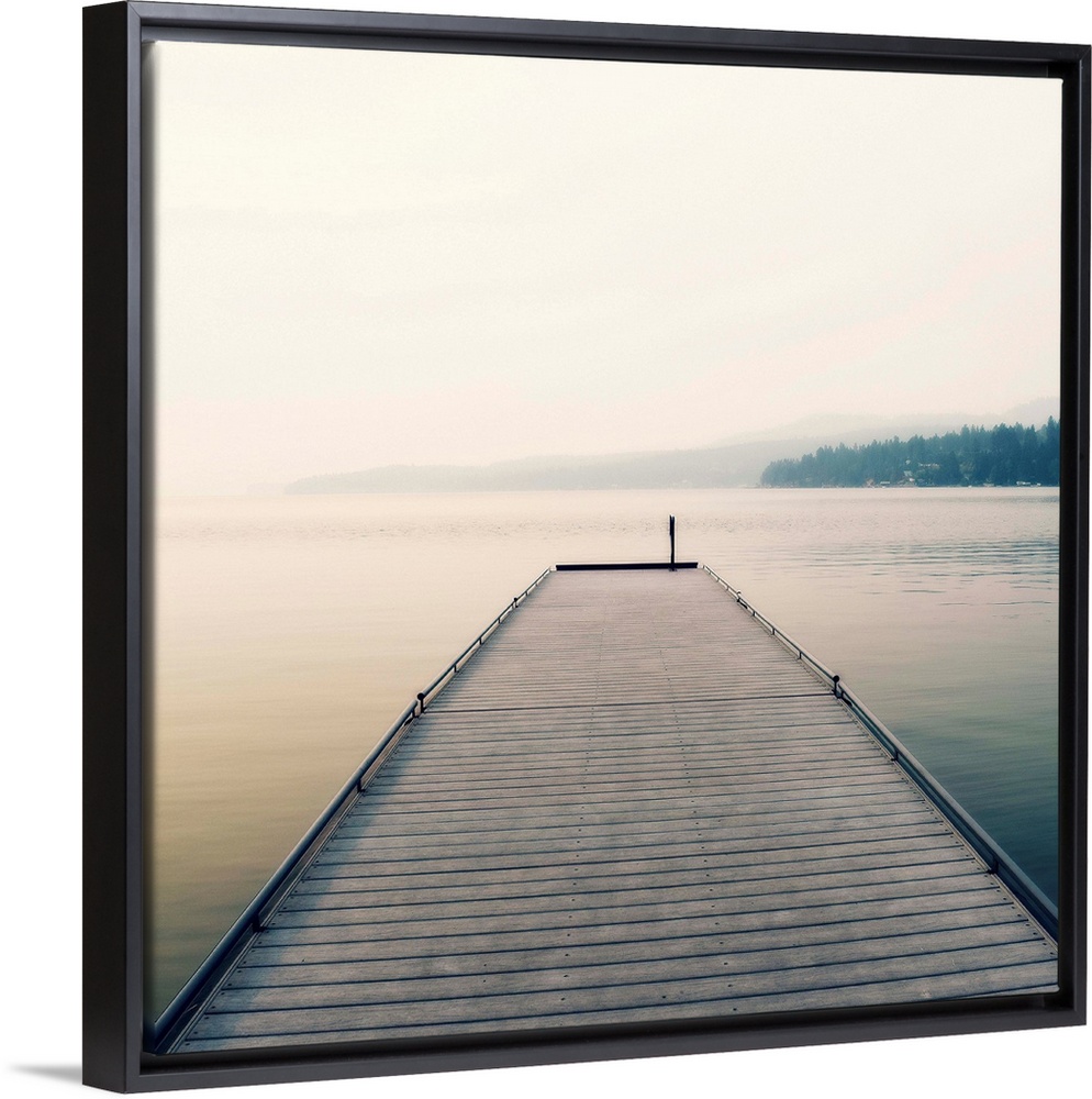 <p>Square photograph of a wooden pier leading out the the middle of a foggy lake.</p>