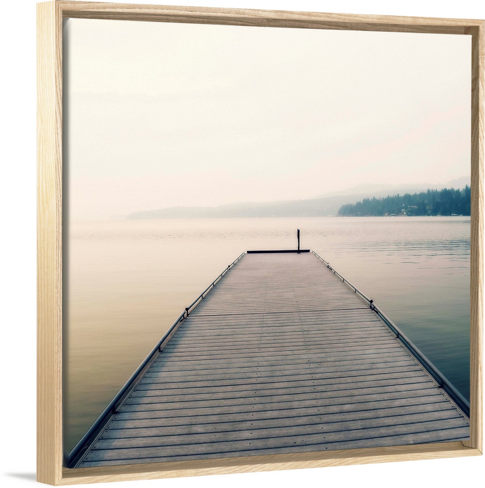 <p>Square photograph of a wooden pier leading out the the middle of a foggy lake.</p>