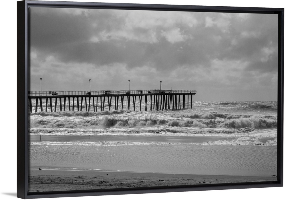 <p>Black and white image of Ventnor Pier in NJ with rough surf caused by an offshore hurricane.</p>