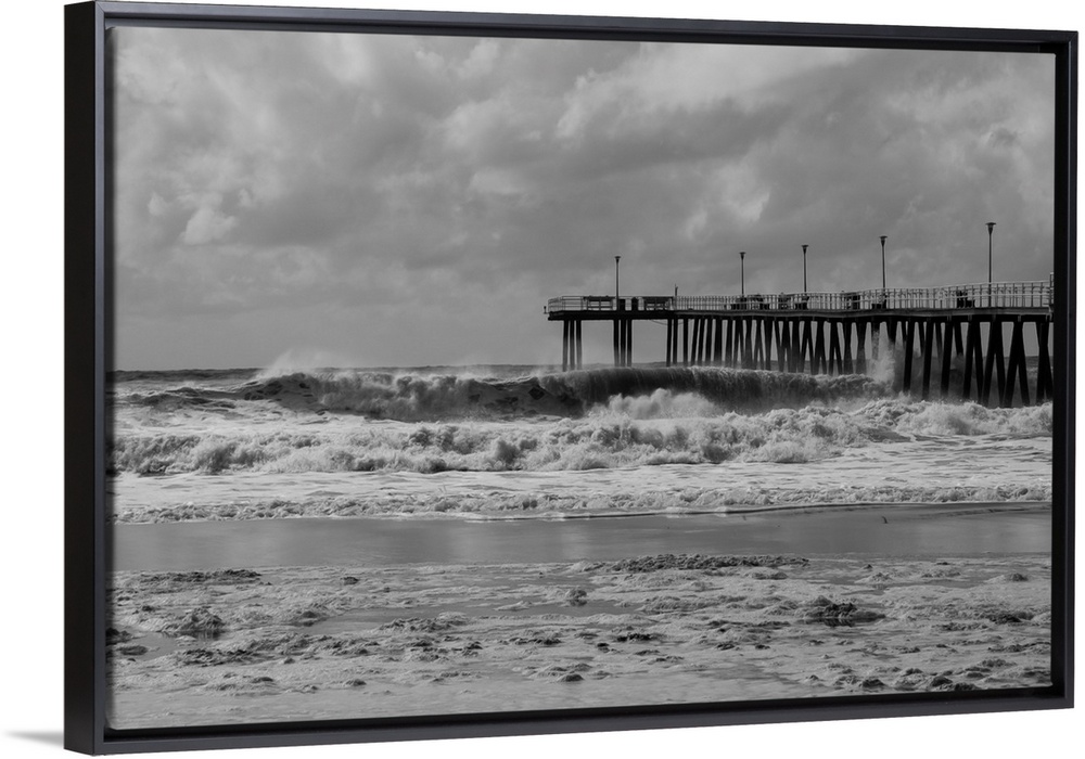 <p>Black and white image of Ventnor Pier in NJ with rough surf caused by an offshore hurricane.</p>