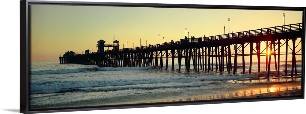 <p>Panoramic wall docor of the silhouette of a pier reaching into the ocean surf at sunset.</p>