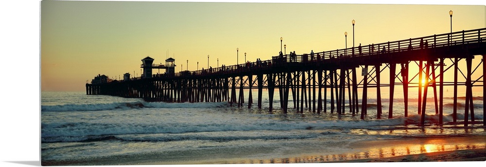 <p>Panoramic wall docor of the silhouette of a pier reaching into the ocean surf at sunset.</p>