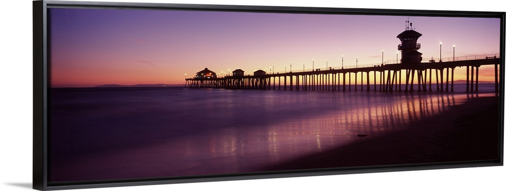 <p>Panoramic photograph composed of a large dock extending into the Pacific Ocean while the waves slowly make their way to the sandy shore.</p>