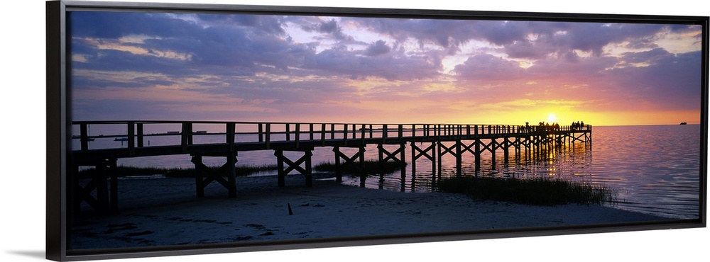 <p>Oversized, panoramic photograph of the pier extending into the water, toward the setting sun at Crystal Beach, Florida.</p>
