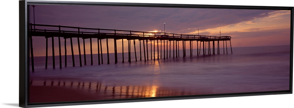 <p>Panoramic photograph of wooden dock stretching into ocean at dusk under a dark cloudy sky.</p>