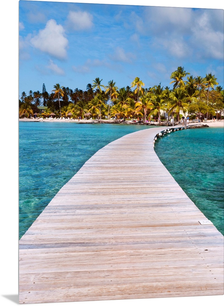 <p>Vertical photograph on a big canvas of a wooden path over clear blue waters, leading toward a tropical island covered in palm trees, in Sainte Anne, Martinique, Caribbean, France.</p>
