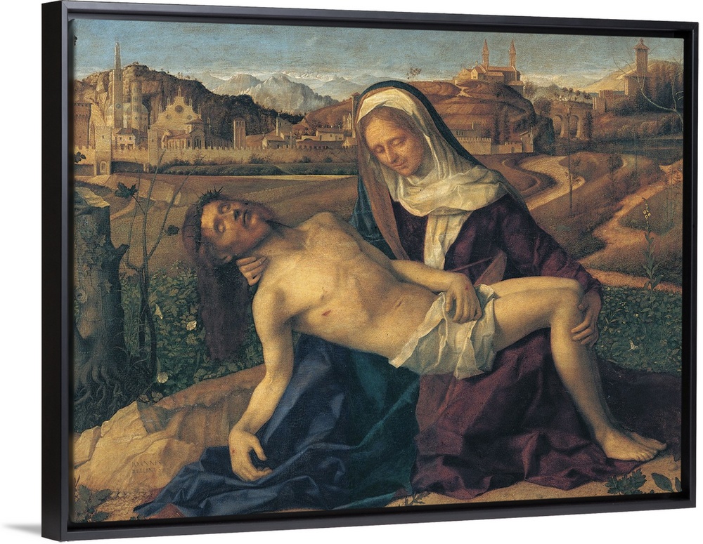 <p>Piet (from the Don delle Rose Collection), by Giovanni Bellini, 1504 - 1505 about, 16th Century, oil on panel, cm 65 x 87 - Italy, Veneto, Venice, Accademia Art Galleries. All. Madonna Virgin Mary blue cloak mantle lifeless body of Christ background hilly</p>