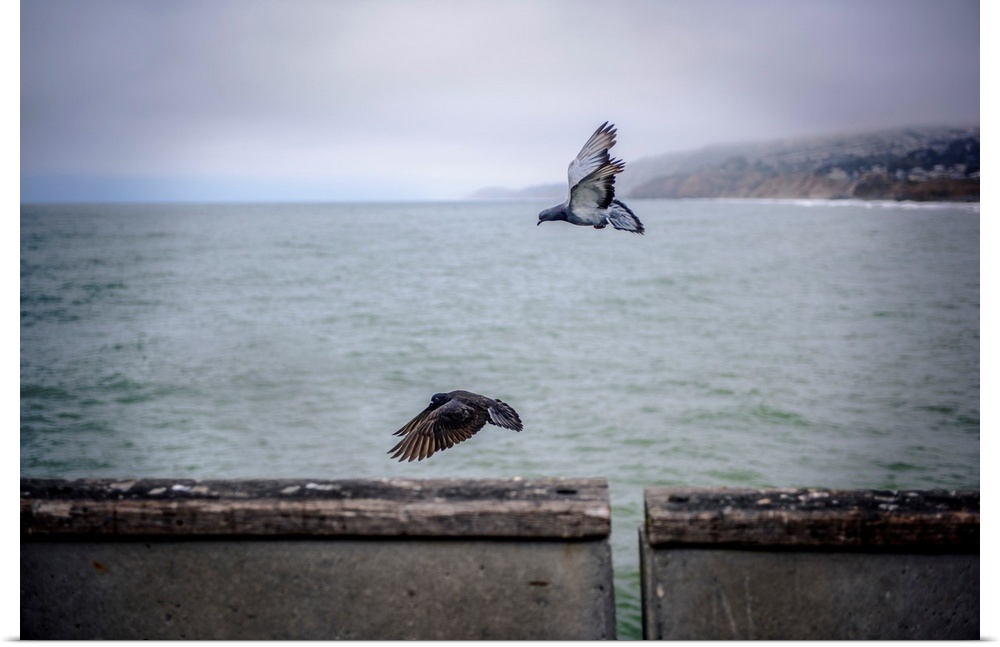 <p>Pigeons in flight with Pacific ocean in the background, San Francisco, California.</p>