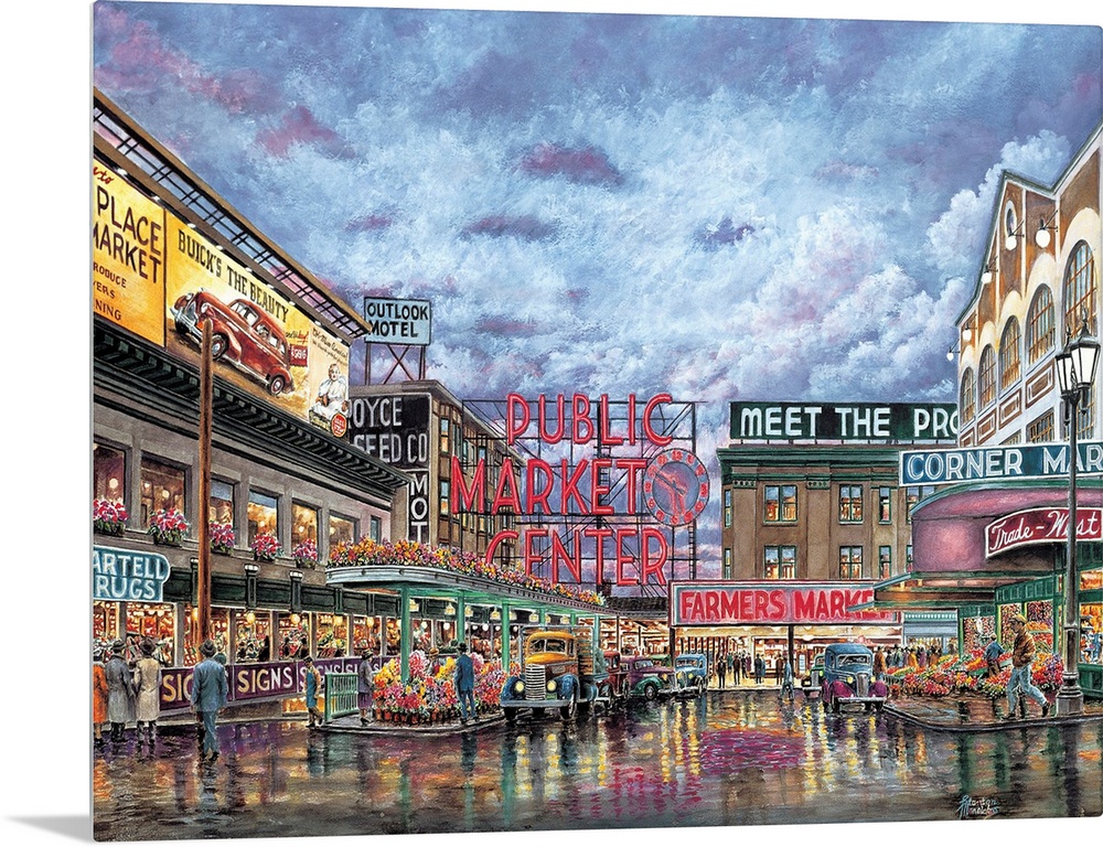<p>Contemporary painting of a city market scene.</p>