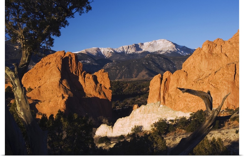 <p>Rock formation and Pikes Peak at Sunrise, Garden of The Gods National Landmark, Colorado Springs, Colorado, USA, February 2006</p>