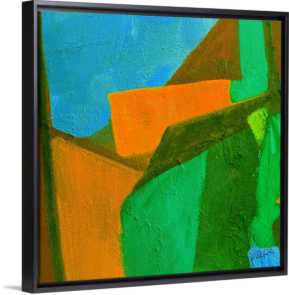 <p>Bright square abstract painting with green, blue, and orange shapes fitting perfectly together with a sponge-like texture on top.</p>