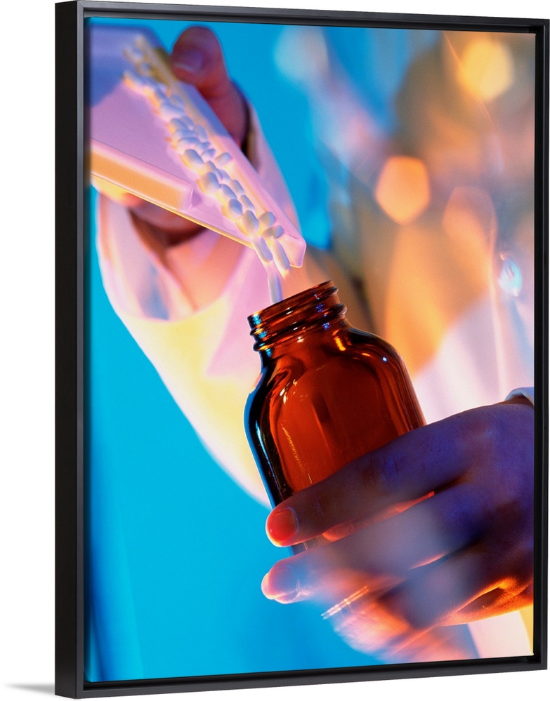 <p>Dispensing pills. Hand of a pharmacist holds a white tray used to count pills (tablets) whilst pouring the pills into a bottle. In this way a drug prescription is dispensed.</p>