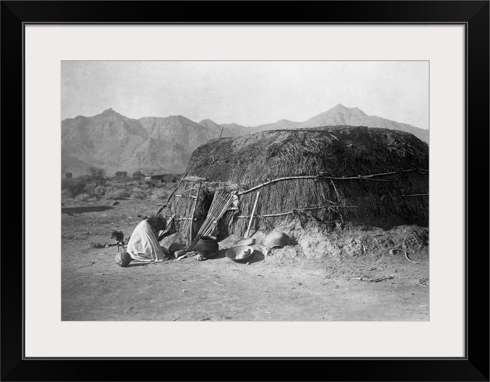 <p>A photograph of a Pima round dwelling, or ki, published in a portfolio supplementing Volume II of The North American Indian (1908) by Edward S. Curtis.</p>