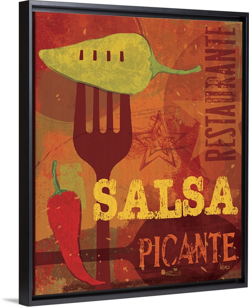<p>Decorative wall art for the kitchen or a restaurant space this wall art shows hot peppers, a fork, a spoon, a graphic, textured background, and the text restaurant, salsa, and picante.</p>