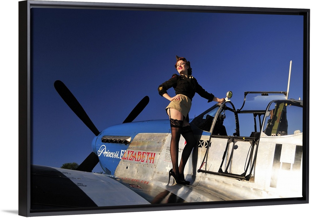 <p>Pin-up girl standing on the wing of a P-51 Mustang fighter plane.</p>
